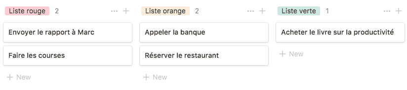 Une fois les 3 listes créées, on doit se concentrer sur l’une après l’autre. On commence donc par accomplir uniquement les tâches de la liste rouge. Puis, une fois effectuée, on s’attaque à la liste jaune puis à la liste verte.